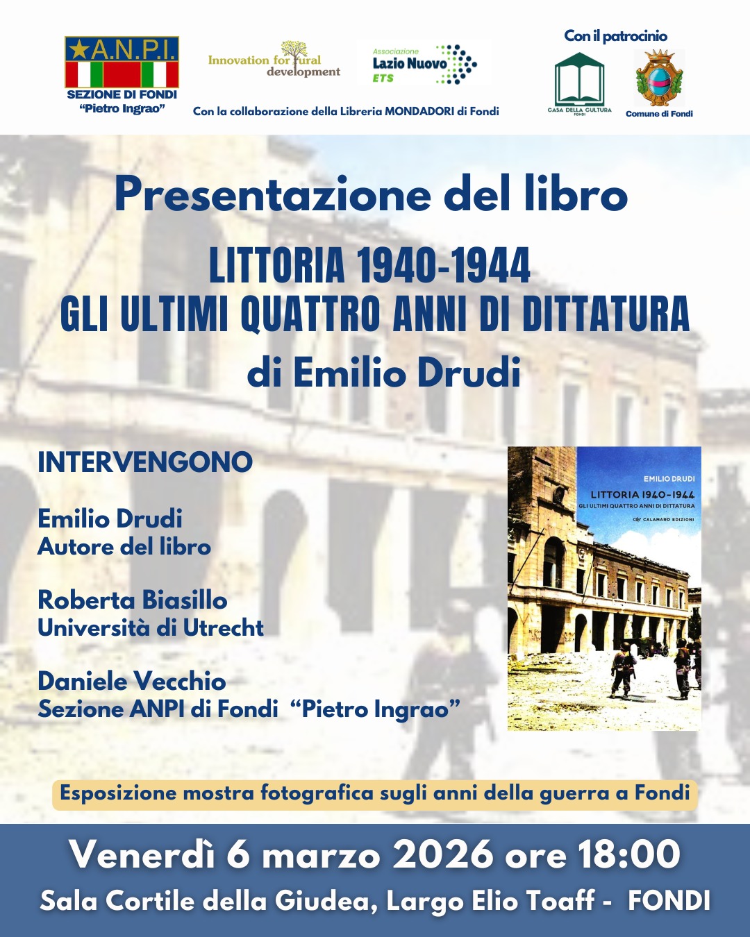 Il 7 marzo 2025 la sezione ANPI di Fondi “Pietro Ingrao” ha presentato a Fondi, presso il cortile della Giudea, il suo libro Littoria 1940-1944 Gli ultimi quattro anni di dittatura, con la collaborazione di IfoRD APS e dell’Associazione Lazio Nuovo ETS. Hanno interloquito con l’autore Roberta Biasillo, docente di storia contemporanea presso l’Università di Utrecht, e Daniele Vecchio, esponente della sezione ANPI di Fondi.