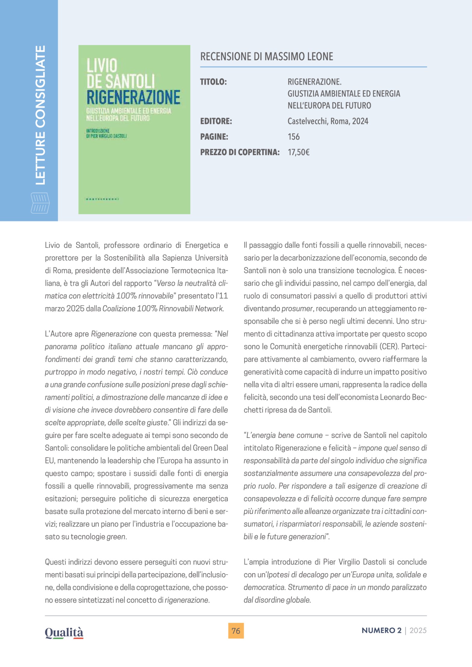Livio de Santoli, professore ordinario di Energetica e prorettore per la Sostenibilità alla Sapienza Università di Roma, presidente dell’Associazione Termotecnica Italiana, è tra gli autori del rapporto “Verso la neutralità climatica con elettricità 100% rinnovabile” presentato l’11 marzo 2025 dalla Coalizione 100% Rinnovabili Network. L’autore apre Rigenerazione con questa premessa: “Nel panorama politico italiano attualeContinua a leggere “Rigenerazione. Giustizia ambientale ed energia nell’Europa del futuro.”